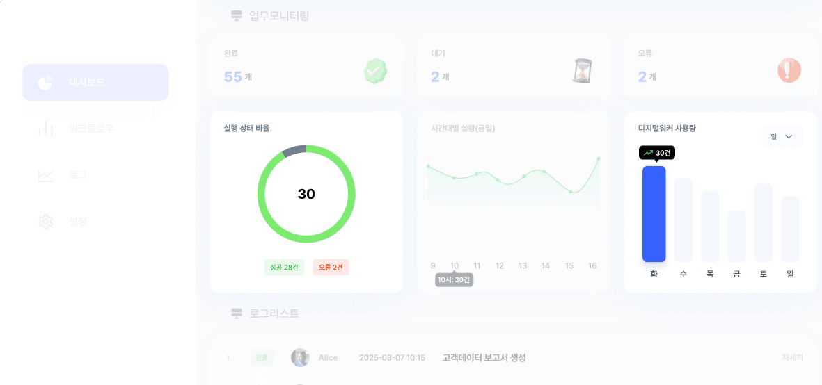상태 분포에서 완료·대기·오류 비율을 즉시 확인합니다.